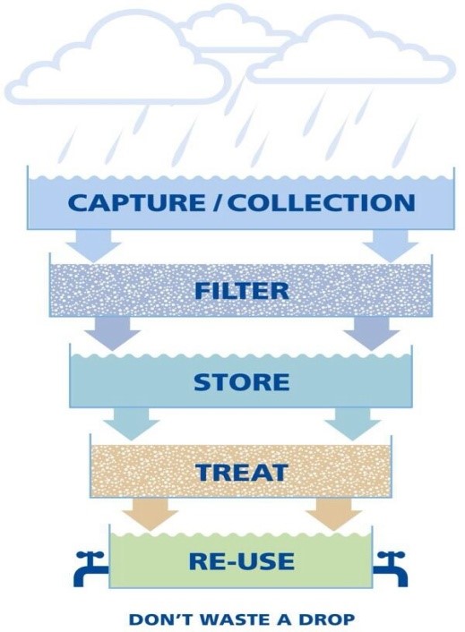 Syöksytorvien kautta sadevesi kulkeutuu säiliöön. Usein käytetään ensihuuhtelujärjestelmiä, jotka ohjaavat ensimmäisen, likaisemman veden pois.